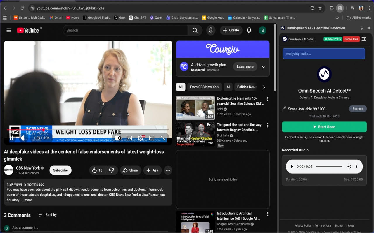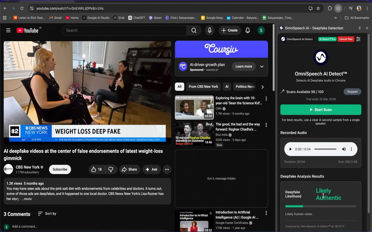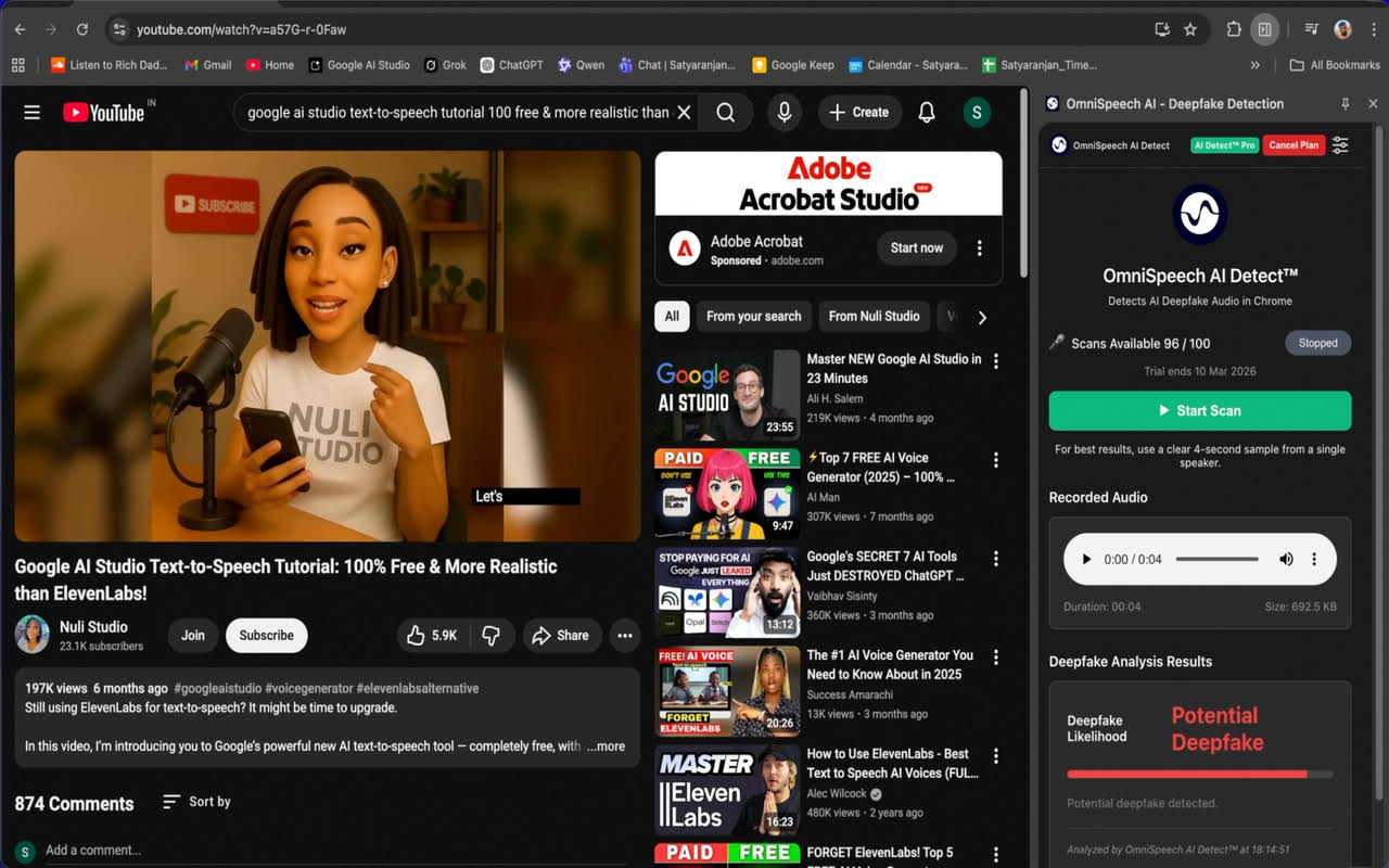 Un panneau dans Chrome, quelques scans gratuits (5 selon l’information dans l’interface), et c’est parti. Côté résultats, c’est un peu mitigé. Les hypertrucages testés ont été détectés, mais certaines voix bien réelles ne l’étaient pas toujours. Rien de disqualifiant, mais assez pour rappeler qu’on est encore dans une technologie en évolution.