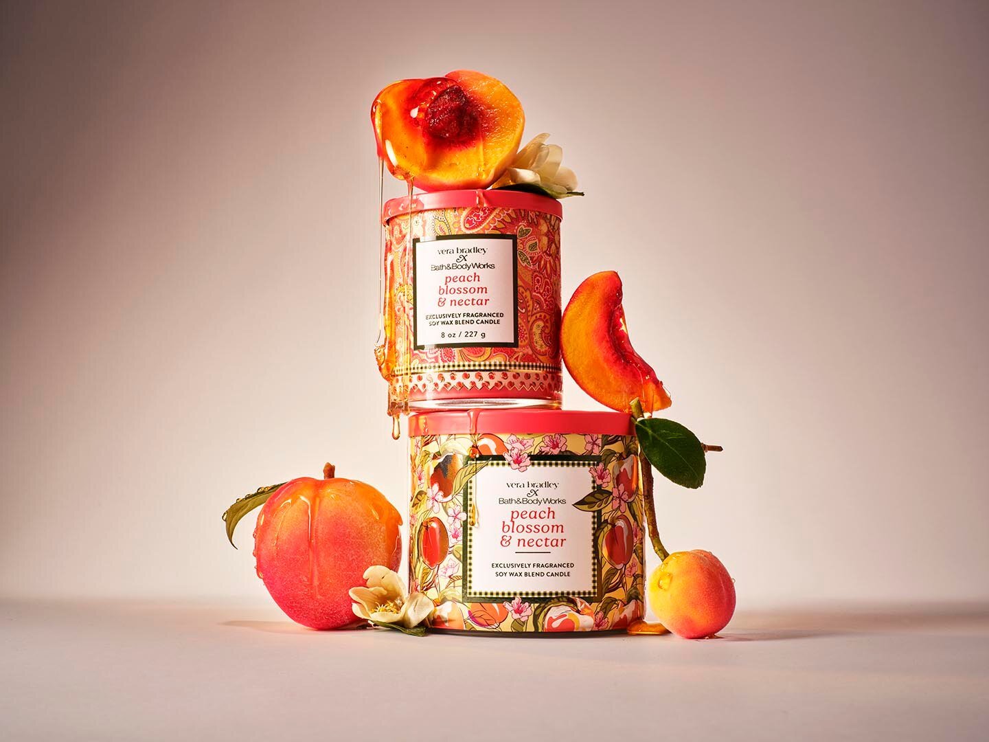Un style audacieux rencontre une magnifique fragrance. Dans le cadre de notre collaboration, la marque adorée Vera Bradley s’est inspirée de notre fragrance Peach Blossom & Nectar pour créer un motif exclusif rien que pour nous, rien que pour vous.
