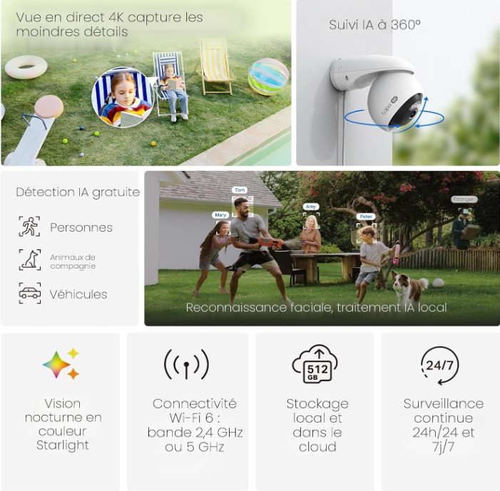 - Fonctions intelligentes : Détection IA (personnes, animaux, véhicules), reconnaissance faciale locale