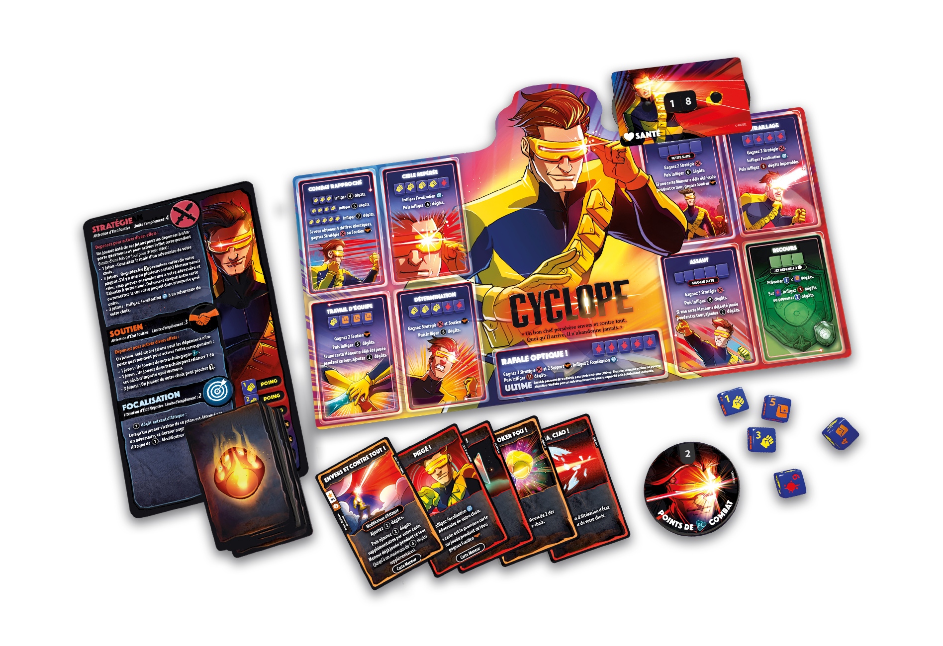 Mon impression : Cyclope utilise des cartes Meneur pour ajouter des dégâts à ses attaques grâce à ses capacités Travail d’équipe et Assaut. Dans un match contre Malicia où ses cartes Meneur ne sont pas sorties (elles étaient toutes au fond de la pioche), Cyclope s’est retrouvé désavantagé. Aussi, il y a beaucoup de décisions à prendre avec ce personnage. Cela donne une partie où on se retrouve confronté au hasard des dés plus le hasard des cartes, rendant ses jetons stratégiques plutôt inutiles si les cartes permettant d’aller les chercher ne sortent pas. Cyclope a donc été vaincu par Malicia alors qu’elle avait toujours 17 points de santé.