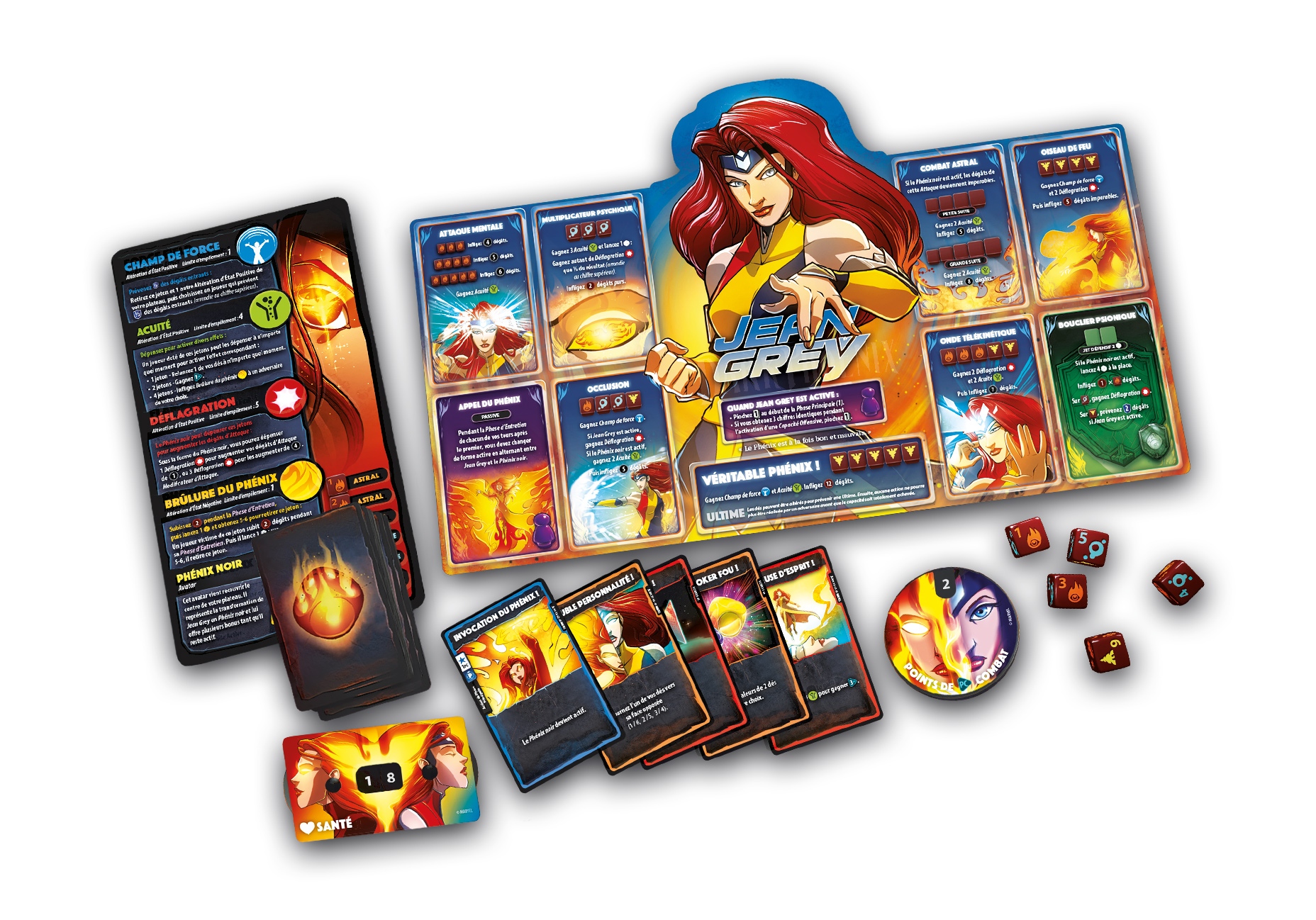 Mon impression : Malgré sa difficulté de 6, je n’ai pas trouvé Jean Grey difficile à prendre en main. Il faut simplement se concentrer pour ne pas oublier, lors de la phase d’entretien, d’alterner entre Jean Grey et le Phénix Noir. Dans un match contre Captain Marvel, Jean Grey s’est retrouvée nez à nez avec elle, se faisant vaincre alors que l’adversaire avait seulement 3 points de santé. À sa défense, elle s’était retrouvée avec un tir à blanc lors de son premier tour, ayant surestimé sa chance. Le Phénix noir lui a peut-être plus nuit qu’aidé, la privant de sa phase de revenu (1 carte et 1 point de combat), un tour sur deux. Mais son champ de force lui a évité la moitié des dégâts sensés lui être infligés à plus d’une reprise. Ses jetons Déflagration ne peuvent être utilisés que sous la forme de Phénix, pour augmenter ses dégâts d’attaque (1 jeton pour 1 dégât ou 3 pour 4). Même sa défense dépend de sa forme actuelle, Jean Grey ne lançant que 2 dés (Phénix noir, 4).