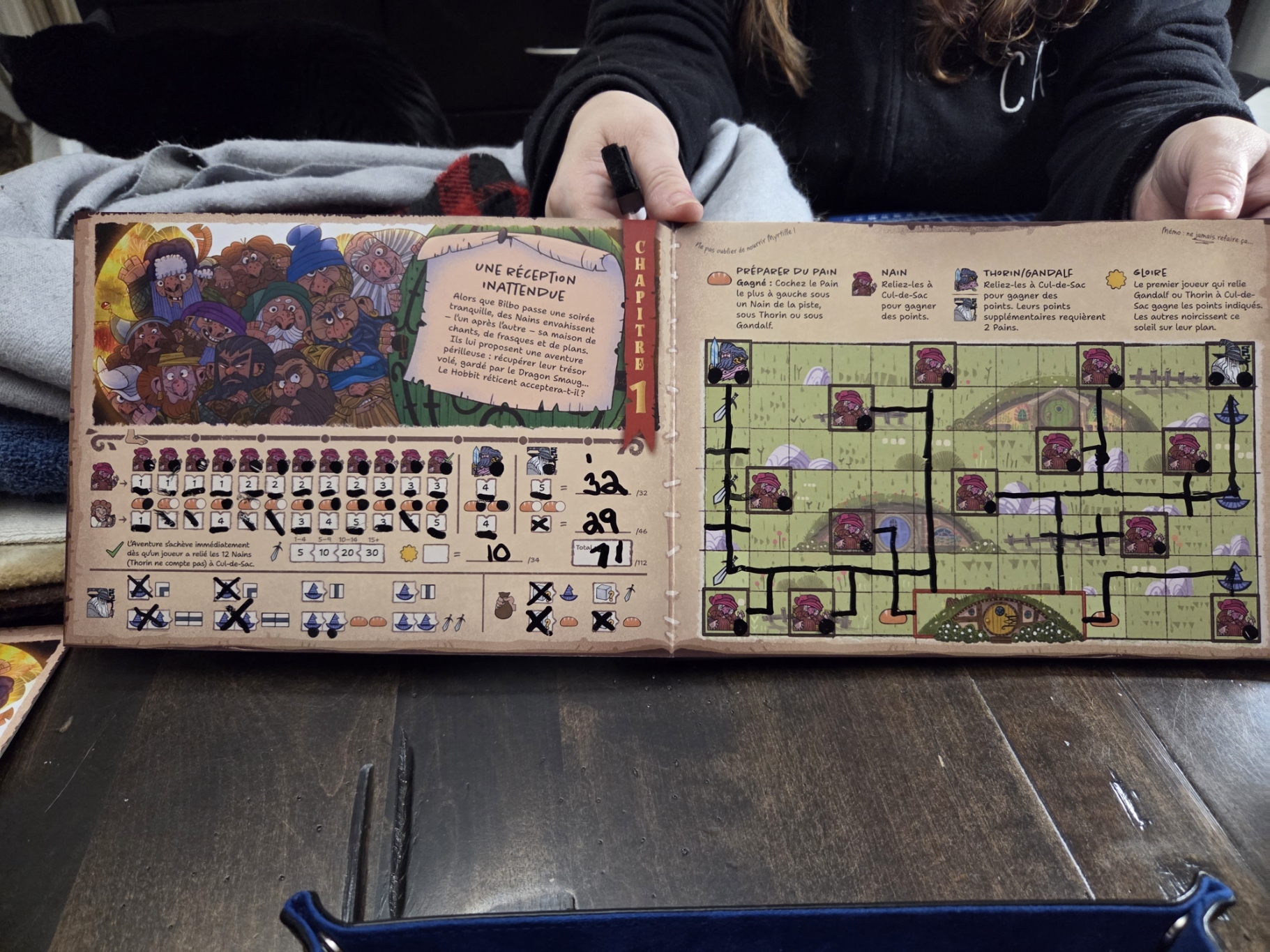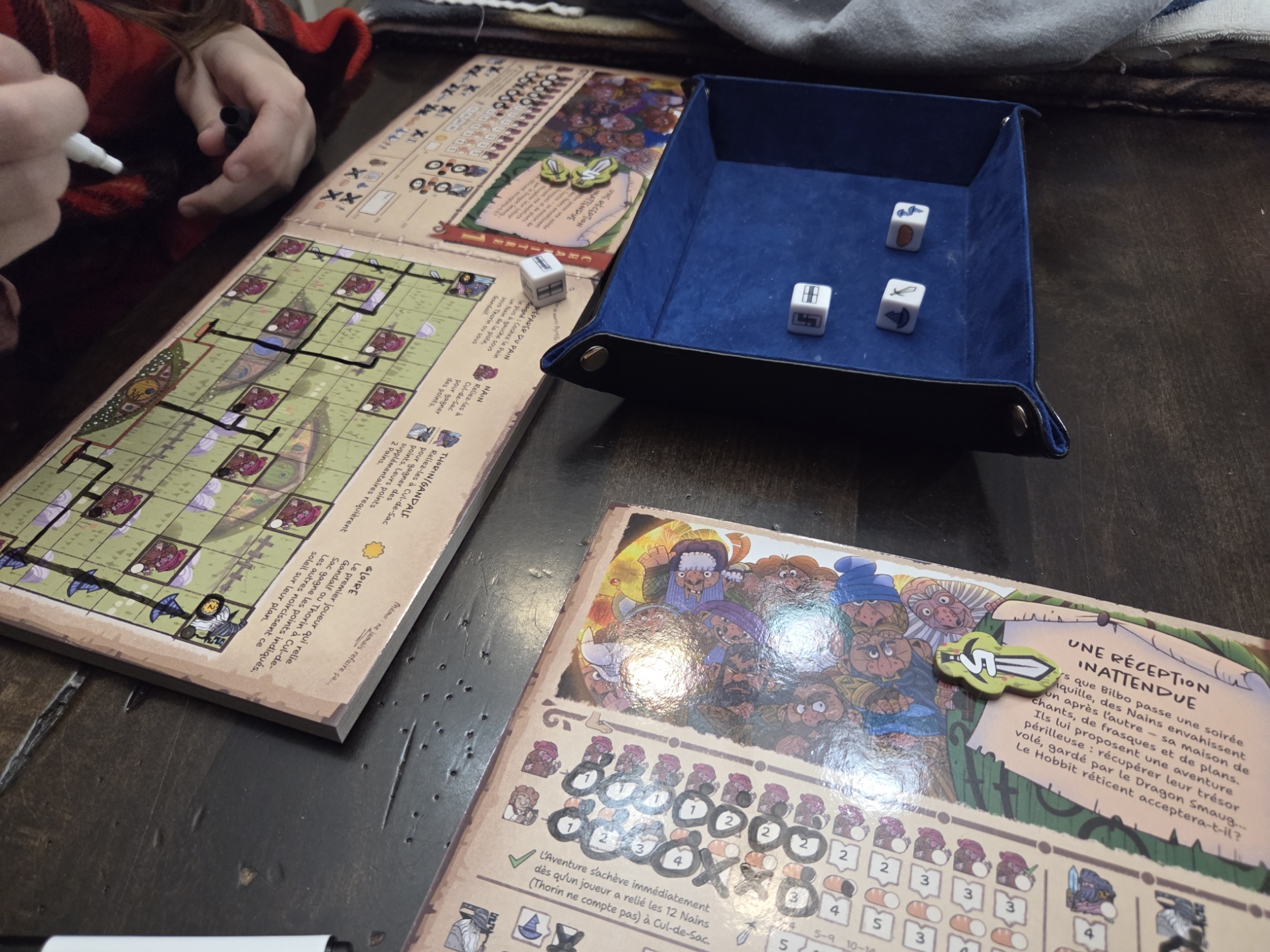 Chaque joueur dispose d’un livre d’histoire en carton épais qui lui servira de planche de jeu. Chacun des scénarios est représenté sur deux pages avec d’un côté les instructions et l’endroit où entrer les points, et de l’autre une carte divisée en cases. Le but du jeu varie en fonction du scénario choisi. Par exemple, le premier demande aux joueurs de diriger les douze nains, menés par Thorin et Gandalf, vers la demeure de Bilbo. Ces derniers sont affamés et les joueurs devront tenter de mettre la main sur suffisamment de pain pour tous les nourrir.