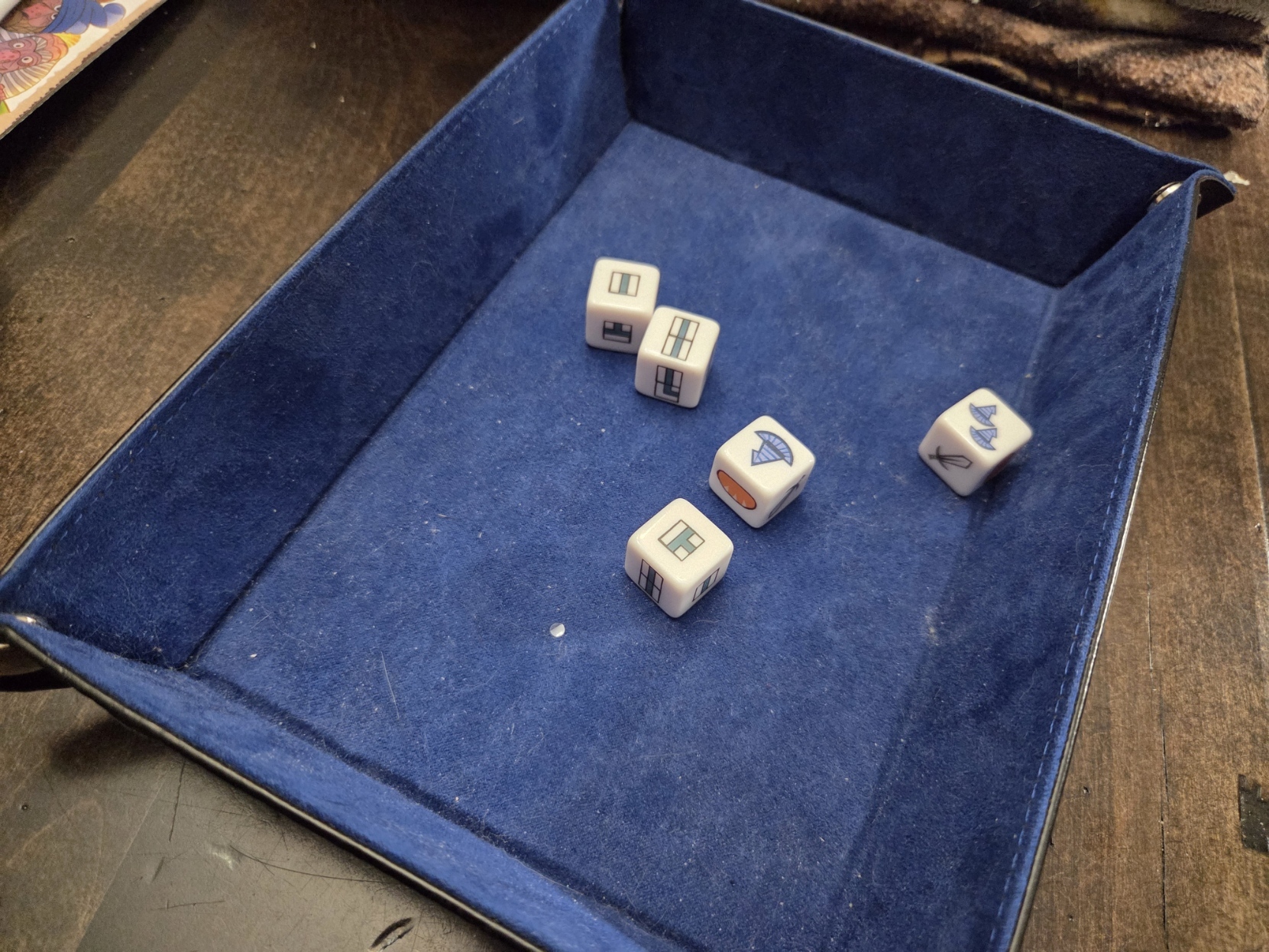 Les autres faces des dés représentent les ressources qui sont les épées, les pains et les chapeaux de magicien. Ces ressources auront des fonctions différentes selon le scénario choisi. Les épées peuvent simplement donner des points de victoire en fin de partie ou servir pour vaincre des ennemis sur la planche de jeu. Les pains seront utilisés pour nourrir ses personnages ou servir de leurres. Enfin, les chapeaux de magicien vous donnent accès à des pouvoirs magiques comme créer des ressources ou rallonger un chemin. Ces pouvoirs sont multiples, mais peuvent être utilisés seulement une fois par partie.