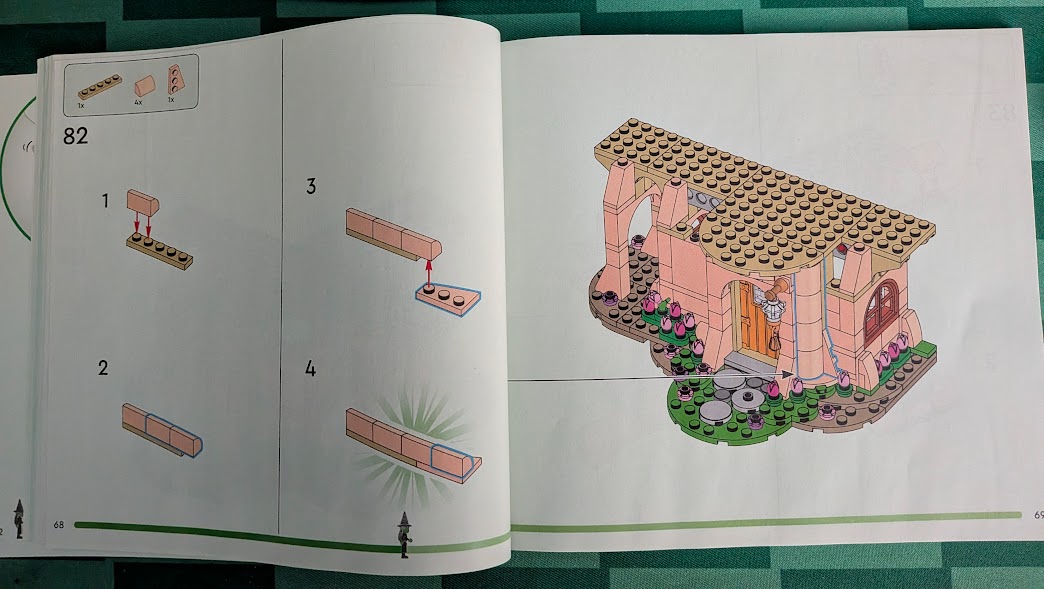 Puisque je n’avais pas bâti de blocs LEGO depuis un certain temps, c’était la première fois que je pouvais admirer les changements apportés aux instructions en 2021-2022. Comme on peut le voir sur l’image plus bas, ce dernier est plus clair puisque les pièces de l’étape présente sont entourées de bleu. Cela permet de savoir où l’on doit attacher les différentes pièces plus rapidement. De plus, on peut suivre notre progression de l’ensemble simplement en regardant dans le bas du livret. Dans mon cas, une image de la figurine d’Elphaba avançait à mesure que je tournais les pages.