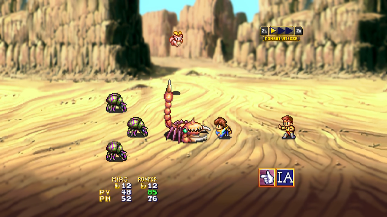 Lunar et Lunar 2 peuvent être joués en mode « classique » ou « remaster ». On peut appliquer un filtre « CRT » comme les écrans cathodiques pour le jeu en mode classique. La version rematricée de chaque jeu est fantastique, à mon avis. La beauté pixelisée est conservée et on sent très bien l’ambiance rétro. Mais, à chacun sa préférence et c’est bien qu’on laisse le choix. J’aime surtout que si vous démarrez une partie en mode classique ou remaster, cela n’affectera pas vos sauvegardes. Elles pourront être chargées dans le mode que vous désirez en tout temps.
