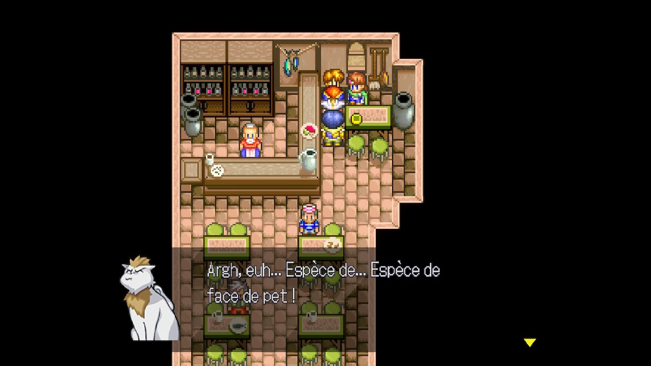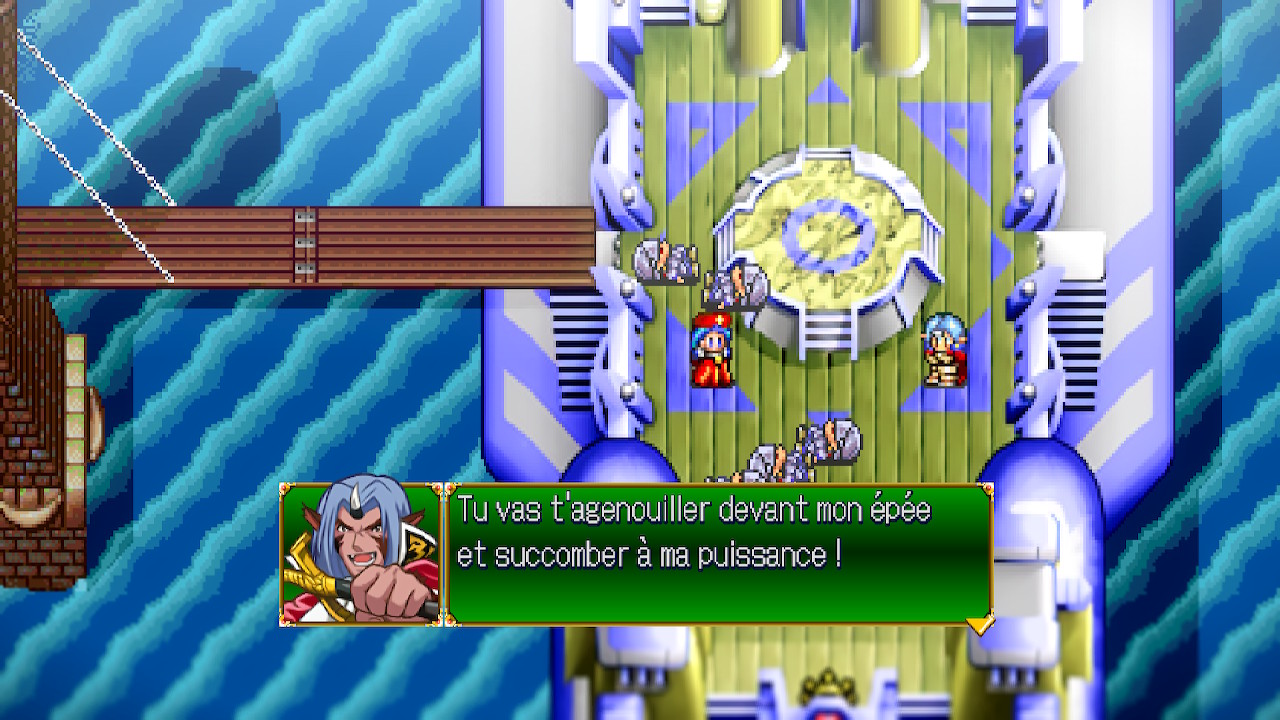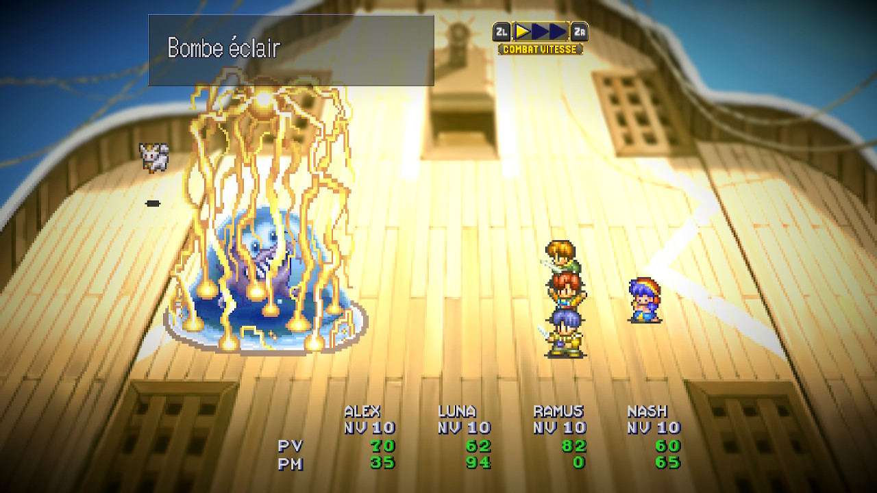 Honnêtement, une chance que l’IA est disponible, car j’ai trouvé que les batailles n’étaient pas extraordinaires. Certes, si on compare à des jeux comme Dragon Quest et Final Fantasy des années 90, le système de Lunar est largement plus intéressant. Cependant, ça ne change pas le fait que j’ai souvent voulu passer les batailles le plus rapidement possible. Justement : une chance qu’on peut aussi augmenter la vitesse du déroulement des batailles automatiques. Par contre, les batailles contre les boss sont très intéressantes et assez difficiles. Puis, si jamais vous échouez au combat, il faut faire comme à l’époque : monter ses niveaux d’expérience. Donc, je dirais que ce n’est pas ennuyeux de jouer à Lunar, c’est pas mal, disons. Peut-être qu’il faut avoir joué à l’original à l’époque pour apprécier plus l’expérience. La nostalgie fait qu’on aime une chose comme elle était avec ses qualités et ses défauts. Je dois admettre que l’expérience est plus amusante en général dans Eternal Blue que dans Silver Star Story.