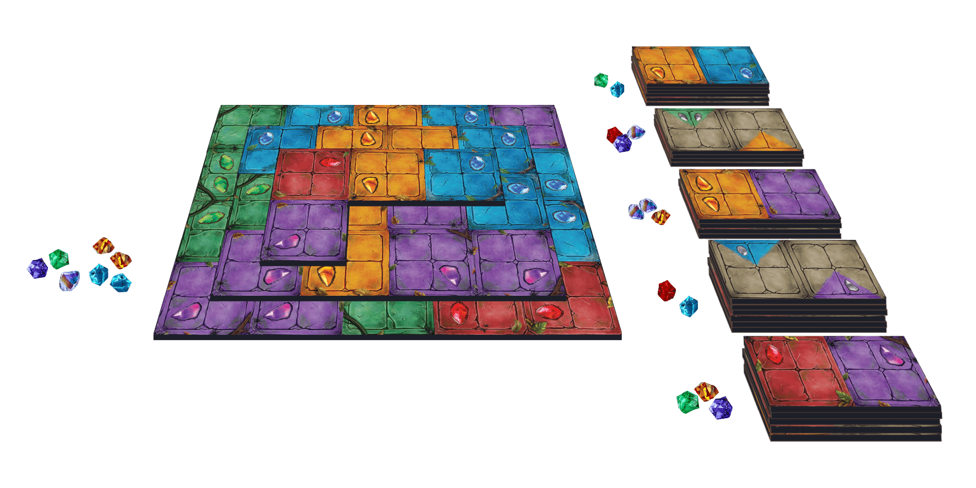 Dans Pyramido : Trésors oubliés, chaque tuile (domino) est associée à une gemme précieuse. Lorsqu’on choisit une tuile, on sélectionne aussi une gemme, qu’on place dans sa pyramide. Celles-ci deviennent des multiplicateurs de points selon les zones de couleur où elles sont placées. Ce système ajoute une couche stratégique absente du premier jeu. - Profondeur tactique